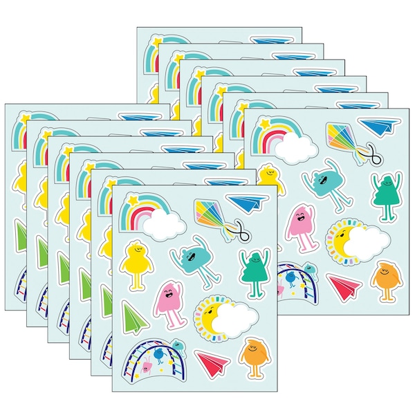 Carson Dellosa's Happy Place Shape Stickers inspire students to keep up the good work. Each pack of fun stickers includes 6 sheets that feature vibrant and cheerful shapes such as smiling people, suns, rainbows, multicolored kites, and an array of bright paper airplanes. Each sheet features 12 stickers, ranging in size from about 1-inch x 1/2-inch to 2 inches x 1-1/4 inches. Acid-free and lignin-free, these stickers are great for encouraging students and rewarding them on a job well done. Stickers are also great for scrapbooking and photo projects, enhancing assignments, goodie bag gifts, and much more. Education happens everywhere, and Carson Dellosa strives to provide the tools needed to inspire learning everywhere it happens. Each pack includes 72 kids stickers. Sold as 12 packs for a total of 864-stickers.