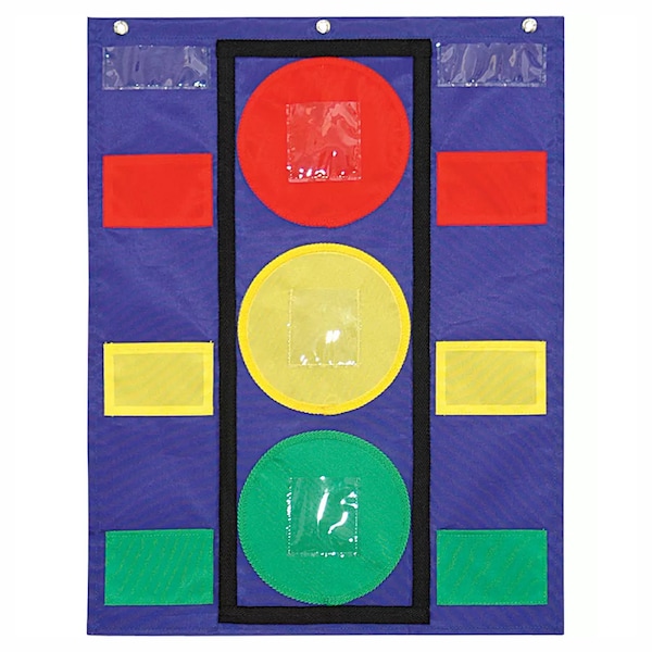 The Stoplight Pocket Chart is ideal for behavior, classroom, and center management as well as differentiating small group assignments! It measures approximately 19.75" x 26" and features: 6 nylon color pockets, 5 clear pockets, 30 write-on/wipe away student sticks, flame retardant material and durable construction, sturdy grommets for easy hanging, and a teacher resource guide.