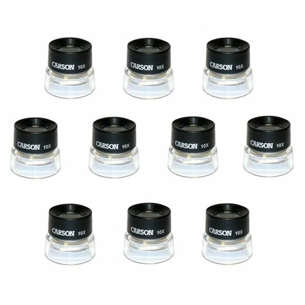 The LumiLoupe from Carson Optical is a set of 10x power stand magnifiers that makes the ordinary extraordinary. The LumiLoupe Magnifying Loupes comes together in a bundled 10-Pack Set. This Magnifier reveals details you've never seen before in things you look at every day. Pre-focused dual lenses allow examination of objects close-up, while a transparent acrylic base permits ambient light to illuminate the subject for bright, clear viewing. Choose the LL-10 (10x power) Magnifier for examining fine details in coins, stamps, film, photography, printing pixels, miniatures, snow crystals and so much more!
