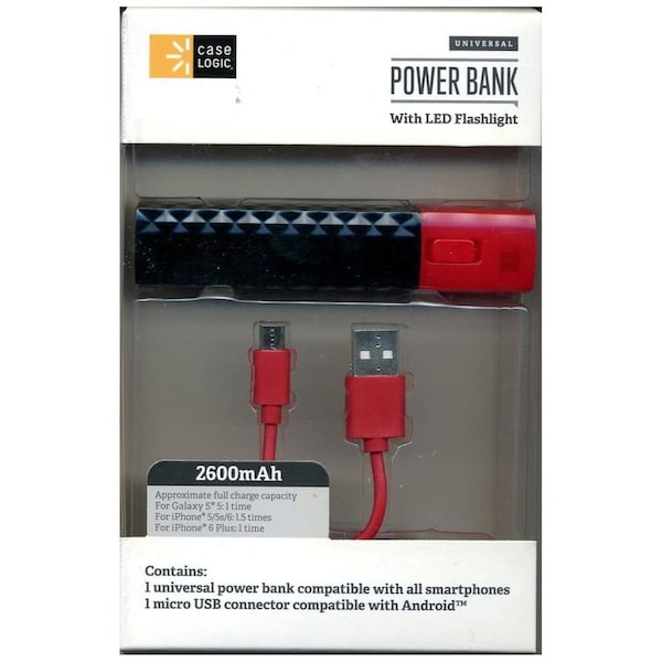 With LED Flashlight Universal Power Bank Cable compatible with: Galaxy S series and most Android devices LED flashlight Input: DC 5.0V - 800mA, max 1000mA Output: DC 5.0V - 1000mA Dimensions WHD: 4.15-in x 0.88-in x 0.78-in Weight: 0.15 Lbs Power Bank approximate full charge capacity: For Galaxy S 5: 1 time For iPhone 5/5s/6: 1.5 times For iPhone 6 Plus: 1 timePackage Contents: 1 - 2600mAh Power Bank 1- Micro USB cable