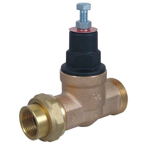 Water Pressure Reducing Valve, High Capacity, Material of Construction Bronze Body, Inlet/Outlet 3/4 In., Single Union Connection, Max. Working Pressure (PSI) 400, Adjustable Range 10 to 70 psi, Pressure Setting 45, Max. Temp. (F) 180 Degrees , Height (In.) 5, Length (In.) 4-5/32, Standards IAPMO Listed, ASSE 1003-2009, Compliance UPC, IPC, cUPC