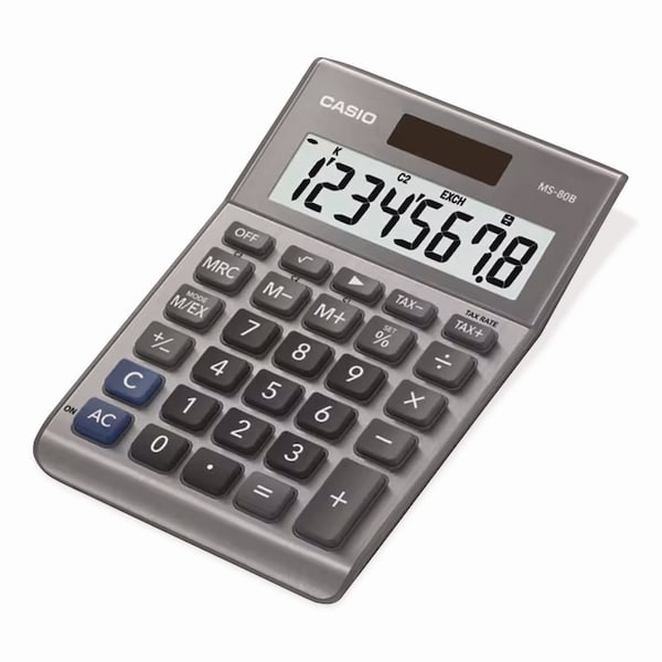 The Casio MS-80B eight-digit desktop calculator meets a variety of business needs. Keep this calculator at your desk for whenever you need answers to math problems. Streamline financial calculations with tax calculation, currency conversion and profit margin functions. Can be operated from solar or battery power, so you can use the calculator both day and night. Three-key memory keeps often used figures accessible for faster calculations, Square root, rounding switch, sign change, grand total, and percent functions help you solve a variety of mathematical problems. Key rollover feature makes sure nothing is lost during high-speed input. Keys are made of plastic.
