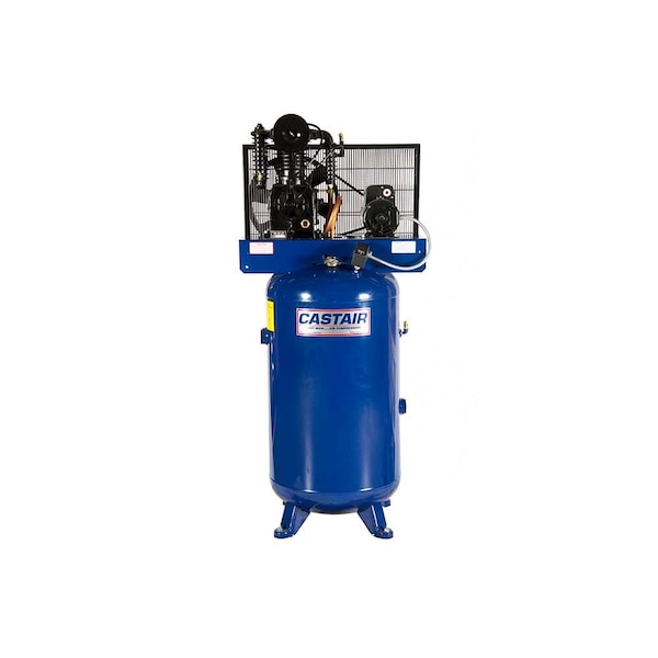 The CASTAIR 5HP commercial series vertical air compressor features truly impressive build quality that's a cut above the competition. This compressor uses a two stage cast iron pump, running with oil lubrication at a low 715 RPM to make the machine quieter, with longer life than oil-less compressors. The pump features steel connecting rods, with automotive type rod insert bears at the crankshaft, with bearings at the wrist pin for long-term reliability. For ease of maintenance and reliability, the pump also has disc and spring valves. The ASME-compliant tank has an 80 gallon capacity, and four legs for stability. The motor is made by Baldor, running at 3450 RPM, with a full 15% service factor.