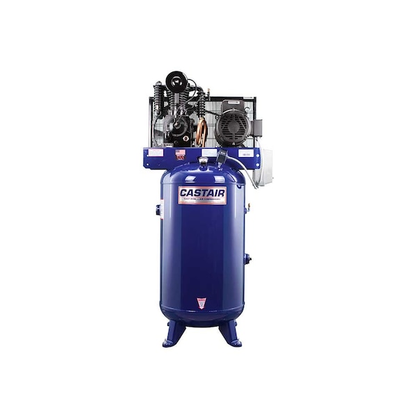 The CASTAIR 7.5HP industrial series vertical air compressor features truly impressive build quality that's a cut above the competition. This compressor uses a two stage cast iron pump, running with oil lubrication at a low 895 RPM to make the machine quieter, with longer life than oil-less compressors. The pump features steel connecting rods, with automotive type rod insert bears at the crankshaft, with bearings at the wrist pin for long-term reliability. For ease of maintenance and reliability, the pump also has disc and spring valves, as well as a centrifugal unloader for loadless startup. This compressor also has ASME-compliant safety valves installed, and a four-leg, 80 gallon tank ASME-compliant tank. The motor is made by Baldor, running at 1725 RPM, with a full 15% service factor.