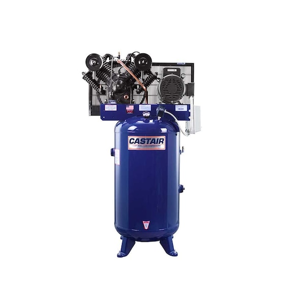 The CASTAIR 7.5HP industrial series vertical air compressor features truly impressive build quality that's a cut above the competition. This compressor uses a two stage cast iron pump, running with oil lubrication at a low 585 RPM to make the machine quieter, with longer life than oil-less compressors. The pump features steel connecting rods, with automotive type rod insert bears at the crankshaft, with bearings at the wrist pin for long-term reliability. For ease of maintenance and reliability, the pump also has disc and spring valves, as well as a centrifugal unloader for loadless startup. This compressor also has ASME-compliant safety valves installed, and a four-leg, 80 gallon tank ASME-compliant tank. The motor is made by Baldor, running at 1725 RPM, with a full 15% service factor.