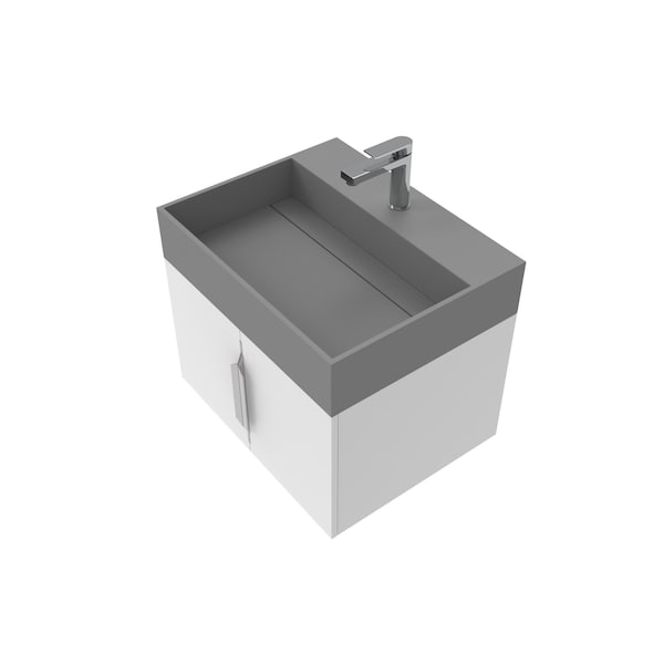 This beautiful, modern, wall-mounted vanity set comes with a base made from high quality birch and plywood and a top made of durable solid surface a type of man-made stone. It's modern minimalist look is enhanced by its mounting to the wall which gives the appearance that the vanity is floating. The doors feature soft close hinges prevent slamming as well as sleek concealed pull handles to enhance the look without sacrificing function. The top features an elegant rectangular sink basin with a concealed drain to give the piece a sleek aesthetic and unparalleled sophistication compared to standard sink basins. This vanity will be a stunning addition to any bathroom renovation.Note: Faucet not included. Portions of this item are handcrafted and handfinished and may have slight variations in color, size, or finish compared to what is pictured. No two items will look exactly the same