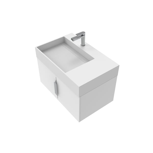 This beautiful, modern, wall-mounted vanity set comes with a base made from high quality birch and plywood and a top made of durable solid surface a type of man-made stone. It's modern minimalist look is enhanced by its mounting to the wall which gives the appearance that the vanity is floating. The doors feature soft close hinges prevent slamming as well as sleek concealed pull handles to enhance the look without sacrificing function. The top features an elegant rectangular sink basin with a concealed drain to give the piece a sleek aesthetic and unparalleled sophistication compared to standard sink basins. This vanity will be a stunning addition to any bathroom renovation.Note: Faucet not included. Portions of this item are handcrafted and handfinished and may have slight variations in color, size, or finish compared to what is pictured. No two items will look exactly the same