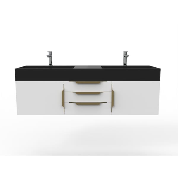Amazon 60" Wall Mounted White Vanity With Black Top And Gold Handles