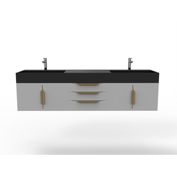 Amazon 72" Wall Mounted Gray Vanity With Black Top And Gold Handles
