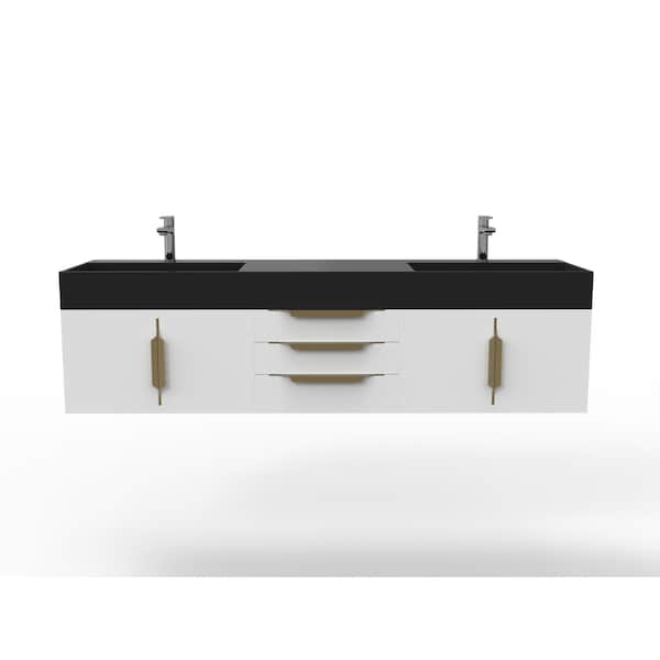 Amazon 72" Wall Mounted White Vanity With Black Top And Gold Handles