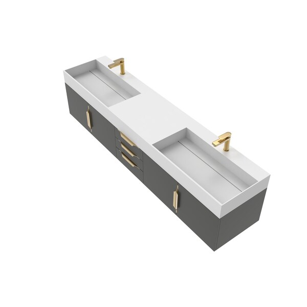 This beautiful, modern, wall-mounted vanity set comes with a base made from high quality birch and plywood and a top made of durable solid surface a type of man-made stone. It's modern minimalist look is enhanced by its mounting to the wall which gives the appearance that the vanity is floating. The doors feature soft close hinges prevent slamming as well as sleek concealed pull handles to enhance the look without sacrificing function. The top features an elegant rectangular sink basin with a concealed drain to give the piece a sleek aesthetic and unparalleled sophistication compared to standard sink basins. This vanity will be a stunning addition to any bathroom renovation.Note: Faucet not included. Portions of this item are handcrafted and handfinished and may have slight variations in color, size, or finish compared to what is pictured. No two items will look exactly the same