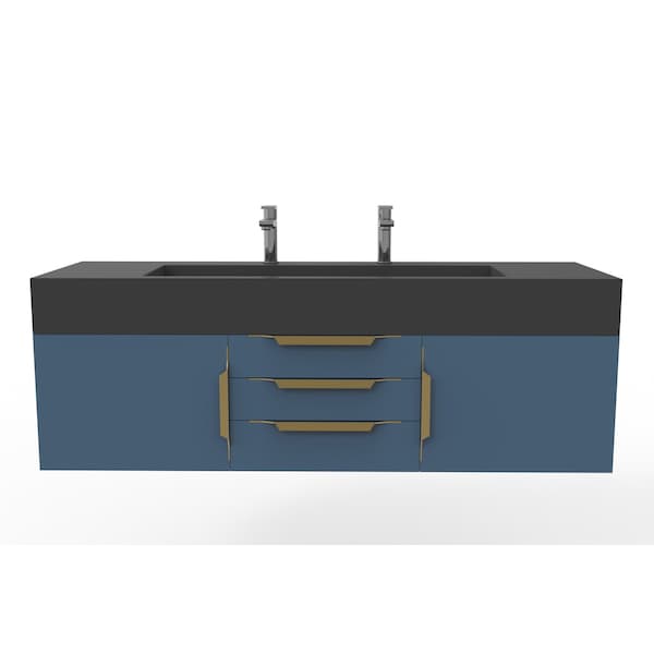 Nile 60" Wall Mounted Blue Vanity With Black Top And Gold Handles