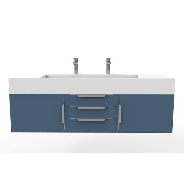 Nile 60" Wall Mounted Blue Vanity With White Top And Chrome Handles