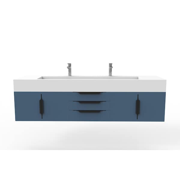 Nile 72" Wall Mounted Blue Vanity With White Top And Black Handles