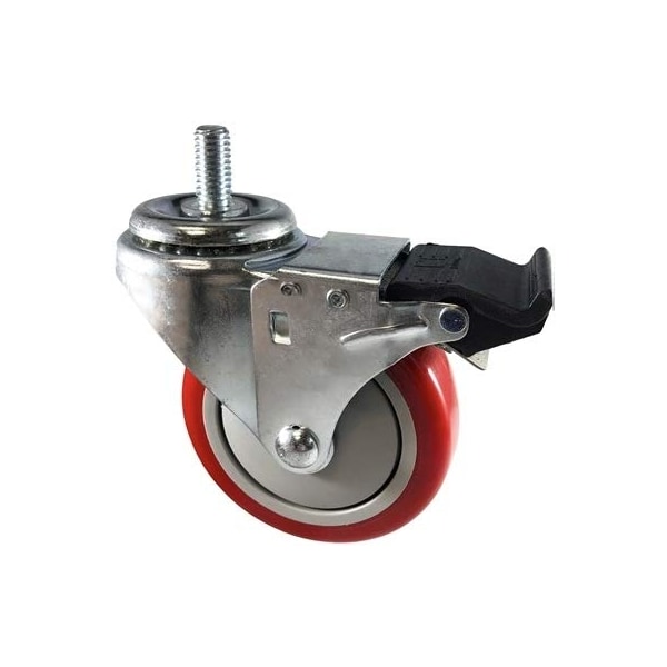 3" X 1.25" RED Polyurethane ON POLYOLEFIN Wheel, 1/2"-13x1" Threaded Stem, Total Locking Swivel Caster, 300 LBS Cap