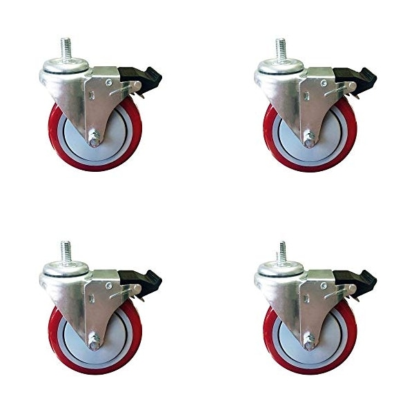 4 Inch Total Lock Caster, Red Polyurethane Wheel, 1/2"-13 x1-1/2" Threaded Stem Set of 4