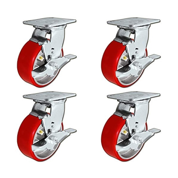 5" x 2" Heavy Duty Swivel Caster Set of 4, Red Polyurethane on Steel Core with Brakes, 4,400 lbs Per Set of 4, Toolbox Casters,
