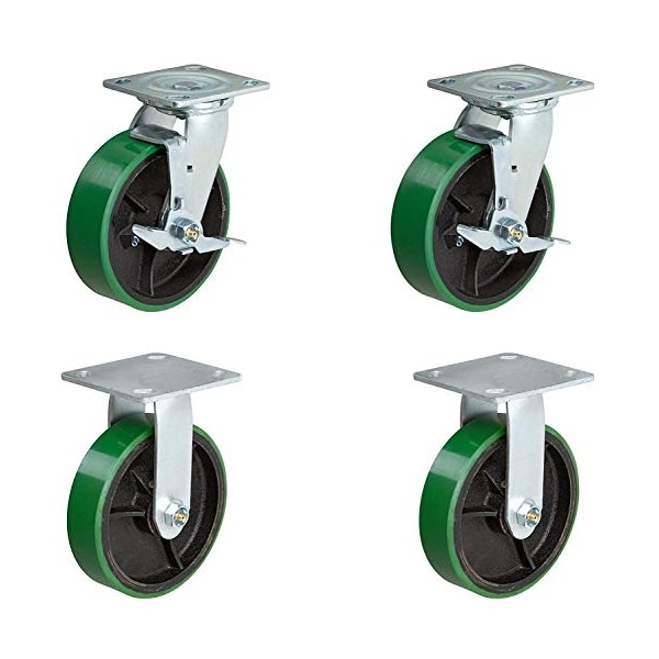 6" Heavy Duty Caster Set, 2 Rigid 2 Swivel with Brake, Green Polyurethane Tread Brand Set of 4, Set of 4, Great Toolbox Replacement Casters Casters Built to Last