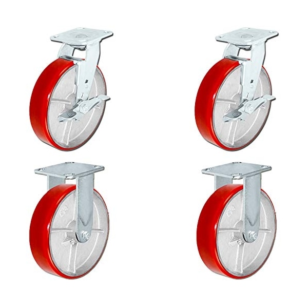 8 inch x 2 inch Heavy Duty Caster Set with Red Polyurethane on Steel Wheels, 1,250 pounds Capacity per Caster, 8" Size, Toolbox casters Set ?