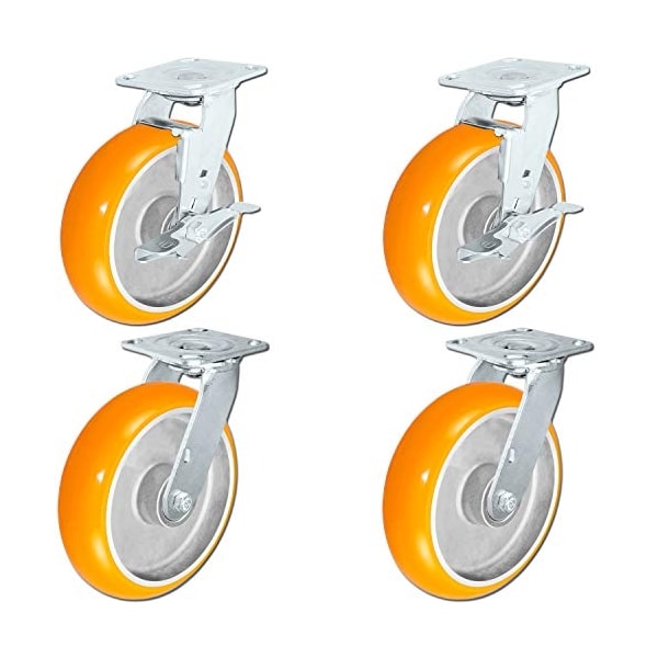 4 Pack, 8" x 2" Non-Marking Orange Tread Polyurethane Casters, 4 Swivel with 2 with Locking Brakes, Heavy Duty Casters