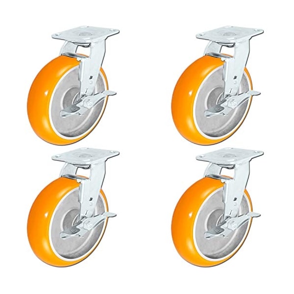 4 Pack, 8" x 2" Non-Marking Orange Tread Polyurethane Casters, 4 Swivel with Brakes, Heavy Duty Casters