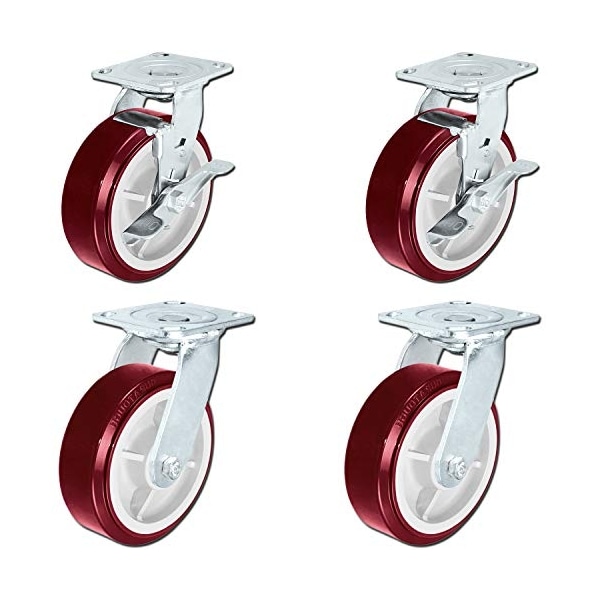 Heavy Duty Polyurethane Swivel Casters with Brake, 6" x 2" Size (Pack of 4)