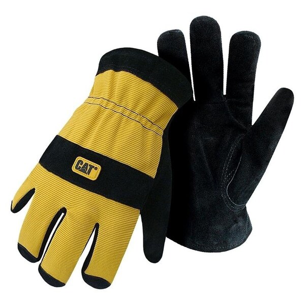 CAT Gloves, Size XL, Split Leather Palm, PolySpandex Back, BlackYellow, Elastic Wrist Cuff, Lined, Resists Water