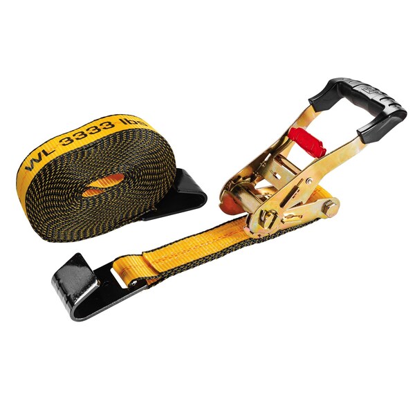 This strap features a 27 foot long x 2 inch wide strap with 3,300 pound working strength/10,000 pound breaking strength with a flat hook. Heavy duty, designed and built to perform in the most demanding tasks and conditions. Not only do they look good but these straps offer strength, performance and convenience. All of our tie downs feature premium materials and construction to deliver construction to deliver consistent performance. Cat straps are there for when you need them, purpose-built for a wide range of applications at work, at play and everywhere in between. • SIZE AND CAPACITY: 27 Feet Long x 2 Inches Wide; 3,300 Pound Working Strength; 10,000 Pound Breaking Strength • PROTECT YOUR GOODS: Built in soft hook and rubber coated hooks help to prevent scratches, scuffs or other damage to both your cargo and your vehicle • VARIETY OF USES: Perfect for moving furniture, securing sports gear, surfboards, bicycles, ATVs, motorcycles, mowers, lumber, crates and more • COMFORTABLE: Oversized rubber-coated ratchet handle is ergonomic, comfortable and provides non-slip gripping action • GUARANTEED: Cat straps are protected by a 100% Satisfaction Guarantee • COLOR: Yellow Strap with Red Release Ring and Black Injection Handle • MATERIAL: Polyester Strap; PE Coated Steel Hooks; TPR Injection Steel Ratchet Handles
