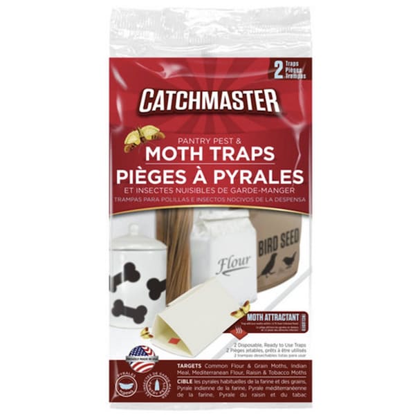 Catchmaster 812 Pantry Pest and Moth Traps - 2PK Eliminate moth infestations in food storage areas such as pantries or storage areas for pet food or birdseed with Pantry Pest Traps. Adhesive trap targets common flour and grain moths by utilizing a professional strength lure. Targets Indian Meal, Mediterranean Flour, Raisin and Tobacco Moths. Place in areas where cereal, pasta, dry pet food, grain and grain based products, dried fruit, chocolate, nuts and spices are stored.Features and Benefits: - Clean, economical and easy to use- Quantity: Two disposable, ready to use traps- Attractant will lure moths within 12 feet from infested food- Non-toxic moth attractant included- Keep out of reach of children, pets, and non-target animals- In case of contact with adhesive, use vegetable or mineral oil to remove from skin or pets fur Specifications: Dimensions: 2in W x 5.25in D x 3.5in H