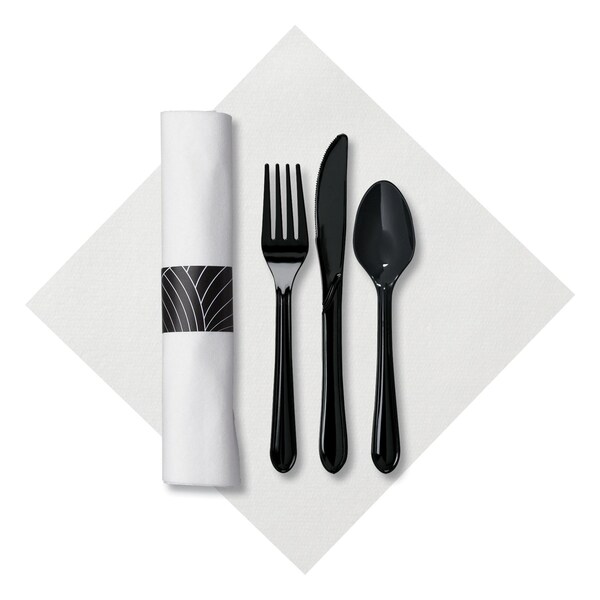 Add practical elegance to your meal service with help from our 8.5" Pre-rolled Linen-Like CaterWrap White Dinner Napkins with Black Cutlery 200 ct. Each rolled cutlery contains one 17" Linen-Like napkin, one black plastic fork, one black plastic knife, one black plastic spoon, and one napkin band with a black and silver swirl design. They come pre-rolled for your convenience. Linen-Like napkins are made from a premium material that looks like real linen and will last an entire meal. Grab these for your business or event today!