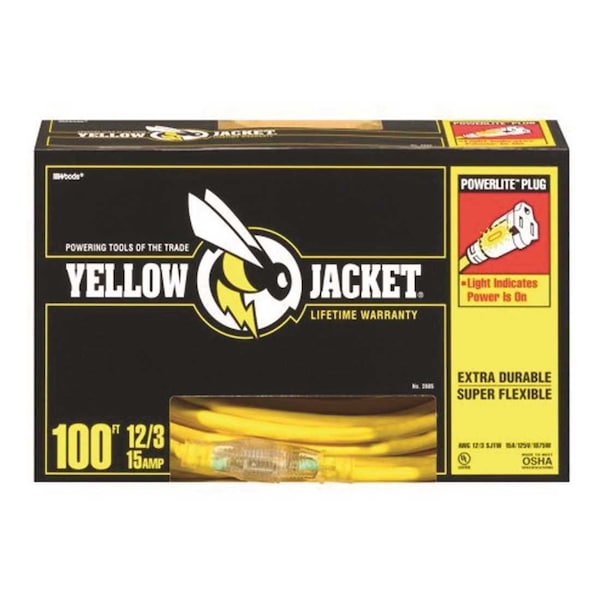CORD EXT WITH/LT12/3X100FT YEL Specifications: Application: For Industrial and Construction Job Site Power Includes: Connector Plug Lighted End Exclusive Yellow Jacket compound is more flexible and abrasion resistant at any temperature than standard vinyl compounds. Yellow Jacket extension cords feature a power indicator light in the female receptacle to show that the power is on.