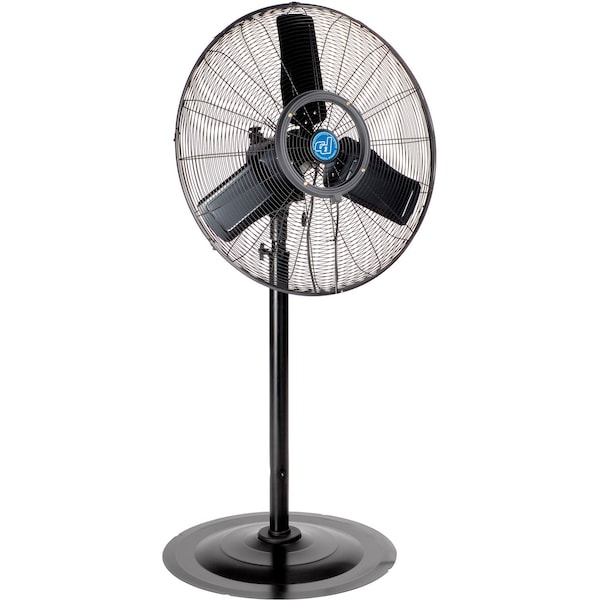 The CD 30in Oscillating Pedestal Misting Fan has a Totally Enclosed Air Over TEAO 3-speed 1/7 HP motor, powering three precision balanced aluminum fan blades. Pedestal fan is height adjustable from 61-1/2in 76-1/2in and comes with a 9.8ft GFCI Type Plug. This oscillating fan uses a 70° oscillating sweep, and allows fixed head positioning. The large pedestal base adds stability and safety. Black powder coated zinc plated grille - UV Resistant. UL and cUL Listed and conforms to UL507 Standard.
