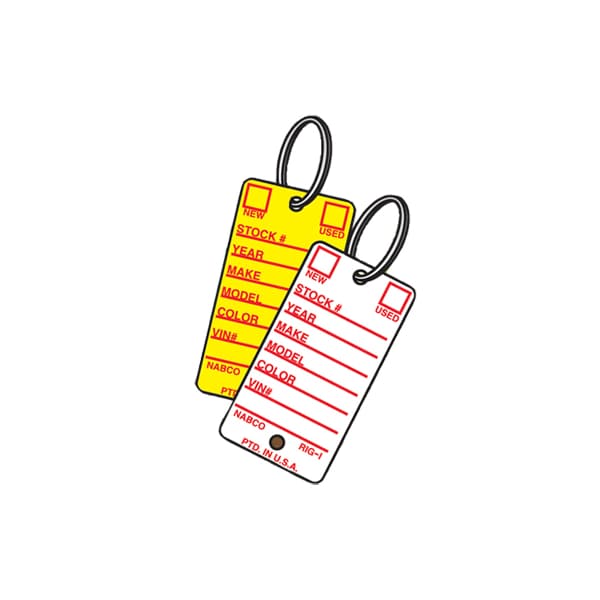 Made of virtually indestructible heavy guage plasic, these key tags are waterproof, fade proof and won't tear at the ring. Available in white or yellow. Each box of 500 includes key tags, twin lock rings and 5 special black pens. Key tag is 1 1/2" x 3". Imprinted sections for New, Used, Stockk#, Year, Make, Color, Seriel#, key#, Price.
