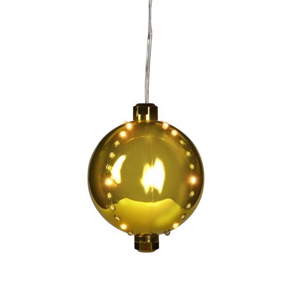 Our 4 in. Round Snowfall Ornament with LED lights in gold is a beautiful and unique addition to any holiday decor. The ornament features LED lights that track vertically down the side. The Round Snowfall Ornament with LED lights is perfect for adding a festive touch during the holiday season.