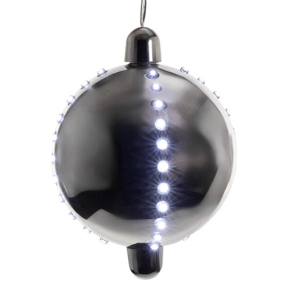 Our 4 in. Round Snowfall Ornament with LED lights in silver is a beautiful and unique addition to any holiday decor. The ornament features LED lights that track vertically down the side. The Round Snowfall Ornament with LED lights is perfect for adding a festive touch during the holiday season.