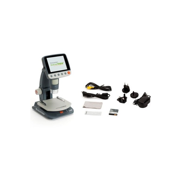 The infiniview lcd digital microscope is a versatile tool that's just as useful out in the field as it is in a classroom. Infiniview comes with a 3.5"" lcd screen and rechargeable lithium ion battery that will last up to 2 hours in the field. You'll be able to capture photos using infiniview's true 5mp digital camera, and even record short video clips of your specimens. Infiniview includes downloadable celestron's capture pro software for use with your pc, and a tv output so you can view the microscope's display on any screen. features: lcd screen full color 3.5"" tft lcd screen with onboard software. Portability rechargeable lithium-ion battery lets you to take infiniview anywhere - you're no longer tethered to a wall outlet or your pc. Magnification 4x to 160x powers, great for low-power observation of 3d specimens. Adjustable stage makes looking at different sized objects easier. Capture stills and videos once you've set up a perfect shot, the infiniview's built-in 5 mega pixel sensor helps you take a vibrant, high resolution photo of what you see on the screen. The shutter trigger is located on the base of the unit, so you can avoid disturbing your shot when pressing the button. Infiniview also records short video of your microscopic discoveries. Tv output use the included av cable with an external monitor, projector, or tv screen. Perfect for use in a classroom. Connect to your pc infiniview easily connects to both windows and mac systems and includes software for both. included accessories: usb cable 2.0 tv out/av cable calibration ruler lithium ion battery for portable use quick setup guide