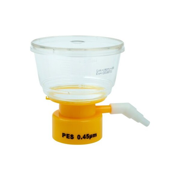 Features: 500ml filters feature expanded 90mm diameter membrane to increase flow and reduce clogs for faster filtration easy-to-read molded graduations marks on bottle top filter bold easy-to-read printed membrane and pore size for easy identification printed lot number and expiration date on every bottle top improved filter support provides faster flow rates angled hose barb adapter fits three size hose diameters and prevents the filter from tipping polyethersulfone (pes) membrane is for high flow and low binding 0.22m pes membrane is the first choice for sterile filtration of cell culture media 0.45m pes membrane ideal for solution clarification nylon (pa) membrane has excellent chemical compatibility and does not require pre-wetting bottle top filters fit on celltreat solution bottles or other standard 45mm threaded solution storage bottles bottle top filters do not include solution bottles