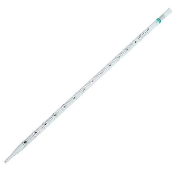 Serological Pipette, Serological Pipet Individually Wrapped, Capacity 2 mL, Graduation Range 0.02 to 2mL, Material of Construction Plastic, Graduation Subdivisions 0.02 mL, Negative Graduations -0.6 mL, Tolerance 2 Percent, Length 27.2 cm, Band Color Green, Class A, Sterile, Standards ASTM E-934, Package Quantity 600