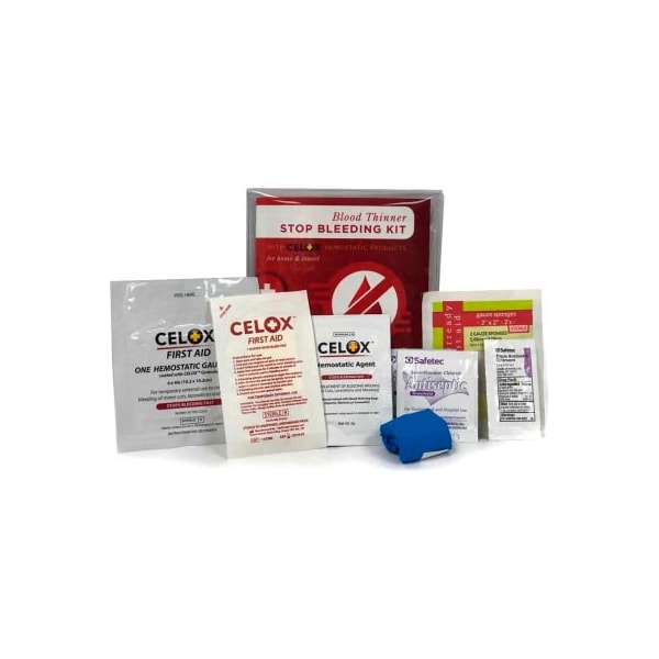 Celox biologistex btsbk bloodthinner stop bleeding kit blood thinner stop bleeding kit with celox hemostatic products is an effective tool for the millions of americans on blood thinner medications who suffer from serious bleeding issues caused by everyday hazards. Ideal for nosebleeds and small injuries such as cuts, scrapes, skin tears and nicks, and minor bleeding resulting from medical procedures, injection sites and skin pricks. kit contains celox 4x4in gauze pad 1 celox nosebleed dressing 1 celox 2g granule pack 1 2inx2in gauze sponge 2 triple antibiotic ointment packet 1 antiseptic towelette 1 pair of nitrile gloves 1