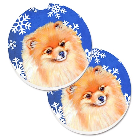 Pomeranian Winter Snowflakes Holiday Set of 2 Cup Holder Car Coaster