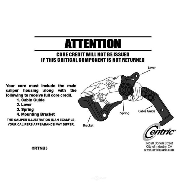 Brake calipers are critical parts of the brake assembly. This Centric caliper is remanufactured to ensure predictable and reliable performance while providing long service life. To achieve like new condition and protection from rust, the part is tumble blasted then treated with an anti-corrosion finish. The caliper is 100% pressure tested and inspected to guarantee proper operation and fitment. Hardware and brackets are included, where applicable, to facilitate an easy installation.
