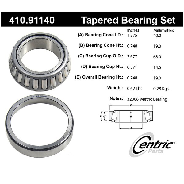 Centric Premium Tapered Roller Bearing & Race Sets - Uniquely designed to mage both thrust and radial loads. Precision Mating Cup & Cone. Engineered from the highest quality materials for extended service life. Widest Range of Tapered Roller Bearings in both metric and inch sizes.