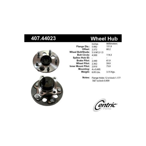 centric premium hub and bearing assembly; with integral abs centric premium non-driven hubs (with integral abs) - engineered from the highest quality materials for extended service life. Widest range of wheel hubs & bearings in the market. 100% o.e. Quality components; premium seals protect internal components; exacting fit and function; complete cataloging, featuring the latest applications and covering from 1940 to 2017. aplication summary: 2008 - 2015 scion xb