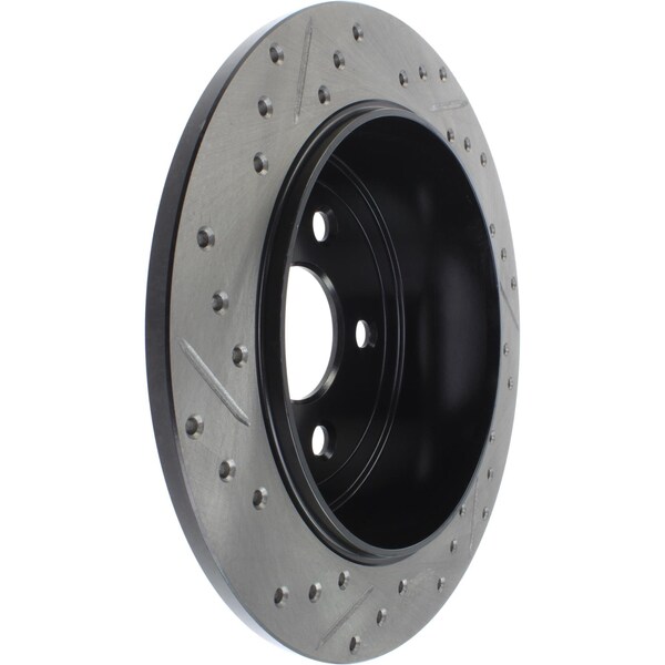 stoptech sport drilled/slotted brake rotor; rear left stoptech drilled and slotted sport rotors are 1-piece direct replacement brake discs for factory brake systems and stock calipers that look great behind your wheels and offer significantly improved braking performance. The unique cross-drilling and slotting aids with heat and brake dust dispersal, prevents glazing of the pads, adds bite and improves wet and dry braking performance. Built to last, the black e-coating provides protection from corrosion and the high carbon metallurgy (in most applications) offers quieter operation, better crack resistance and increased performance. Premium e-coated rotor with advanced metallurgy that greatly reduces pad squeal. Especially effective with higher friction, european style brake pad compounds. Drilled & slotted for increased bite, improved looks and better performance. aplication summary: 2007 - 2017 jeep wrangler