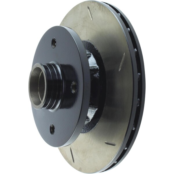 stoptech sport slotted brake rotor; front left stoptech slotted sport rotors are 1-piece direct replacement brake discs for factory brake systems and stock calipers that look great behind your wheels and offer significantly improved braking performance. The unique slotting aids with heat and brake dust dispersal; prevents glazing of the pads; adds bite and improves wet and dry braking performance. Built to last; the black e-coating provides protection from corrosion and the high carbon metallurgy (in most applications) offers quieter operation; better crack resistance and increased performance. Premium e-coated rotor with advanced metallurgy that greatly reduces pad squeal. Especially effective with higher friction; european style brake pad compounds. Slotted for increased bite; improved looks and better performance. aplication summary: 1984 - 1985 mazda rx-7