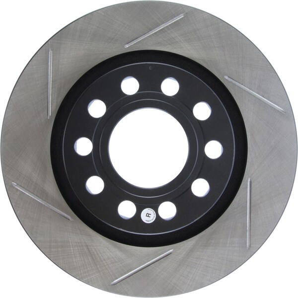 stoptech sport slotted brake rotor; rear left stoptech slotted sport rotors are 1-piece direct replacement brake discs for factory brake systems and stock calipers that look great behind your wheels and offer significantly improved braking performance. The unique slotting aids with heat and brake dust dispersal; prevents glazing of the pads; adds bite and improves wet and dry braking performance. Built to last; the black e-coating provides protection from corrosion and the high carbon metallurgy (in most applications) offers quieter operation; better crack resistance and increased performance. Premium e-coated rotor with advanced metallurgy that greatly reduces pad squeal. Especially effective with higher friction; european style brake pad compounds. Slotted for increased bite; improved looks and better performance. aplication summary: 2004 - 2005 audi allroad quattro