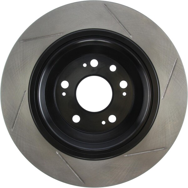 stoptech sport slotted brake rotor; rear right stoptech slotted sport rotors are 1-piece direct replacement brake discs for factory brake systems and stock calipers that look great behind your wheels and offer significantly improved braking performance. The unique slotting aids with heat and brake dust dispersal, prevents glazing of the pads, adds bite and improves wet and dry braking performance. Built to last, the black e-coating provides protection from corrosion and the high carbon metallurgy (in most applications) offers quieter operation, better crack resistance and increased performance. Premium e-coated rotor with advanced metallurgy that greatly reduces pad squeal. Especially effective with higher friction, european style brake pad compounds. Slotted for increased bite, improved looks and better performance. aplication summary: 2009 - 2014 acura tl