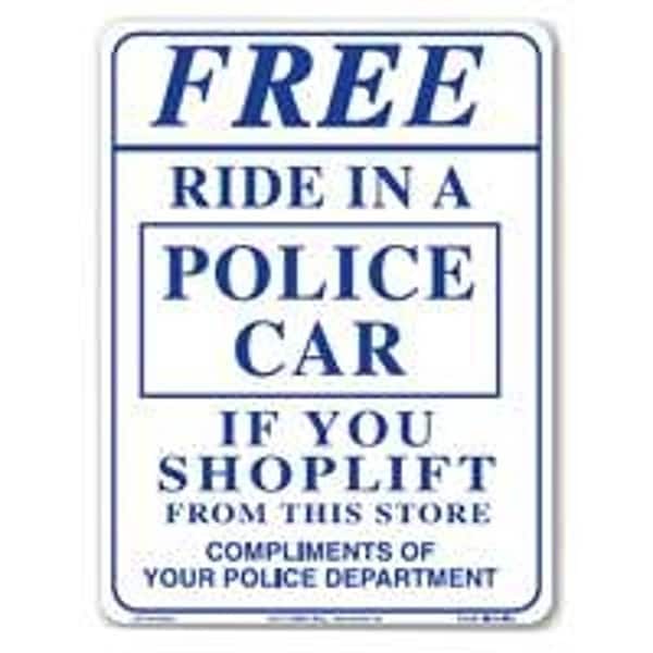 Durable plastic shoplifting signs will help stop shoplifters in their tracks. Signs offer serious warnings in lighthearted language, help deter would-be shoplifters from stealing valuable merchandise. Sign Smile says Smile You're on Camera and Sign Ride says Free Ride in a Police Car.