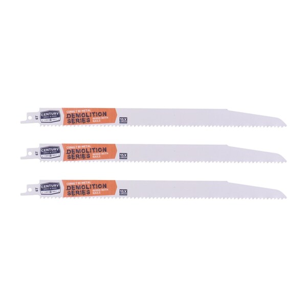Century's Demolition Series Recipe Blades lasts 15X longer when compared to standard carbon alloy blades. Unique nitro hardening process for optimal strength and blade life. Cobalt matrix teeth are fused to a flexible shatterproof shock absorbing alloy backbone for rugged cutting. 7/8" width and heavy duty blade thickness handles demolition and remodeling projects where other blades fail. 1/2" universal shank fits all popular reciprocating saws. 12" overall length. BULK