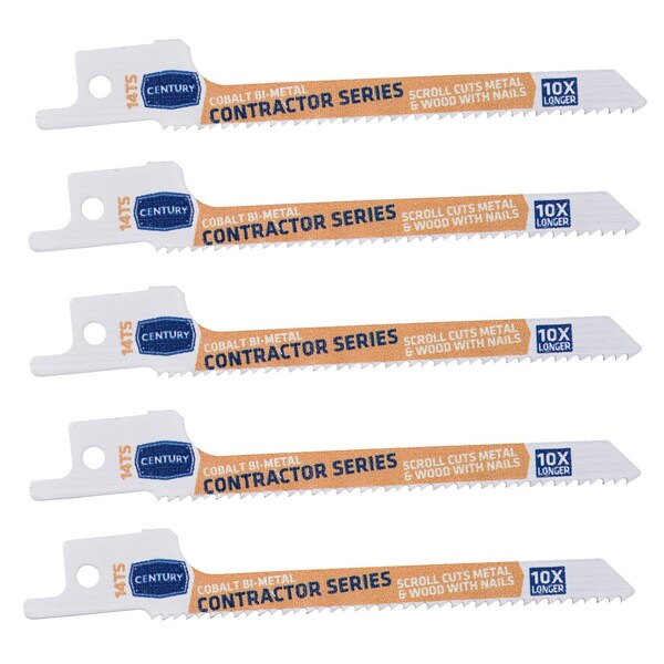 Century's Contractor Series Recip Blades lasts 10X longer when compared to standard carbon alloy blades. Unique nitro hardening process for optimal strength and blade life. Cobalt matrix teeth are fused to a flexible shatterproof shock absorbing alloy backbone for rugged cutting. 1/2" universal shank fits all popular reciprocating saws. 4" overall length. 5-PACK